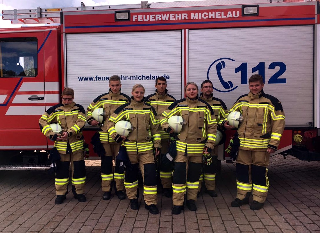 Die neuen Geräteträger(innen) der Michelauer Feuerwehr konnten als "kleines Bonbon" im Anschluss auch gleich die neue Schutzkleidung in Empfang nehmen, die die Gemeinde Michelau seit 2014 für alle Atemschutzgeräteträger bereit stellt. Ein Anzug diese Typs (Jacke mit Gurtsystem, Hose und zusätzliche Flammschutzhaube) kostet rund 1.300 Euro. Hinzu kommen noch rund 250 Euro für den Schutzhelm und 60 Euro für ein Paar Handschuhe.