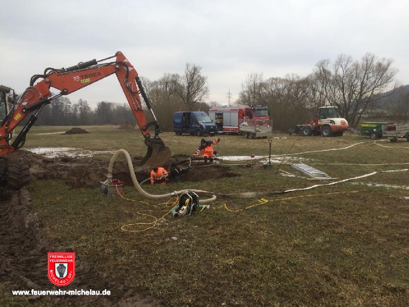 Aufgrund eines Rohrbruchs an einer Hauptwasserleitung wurde die Feuerwehr benötigt. Mithilfe von Chiemseepumpen wurde das eindringende Grundwasser aus der Baugrube gepumpt, damit die Reparatur erfolgen konnte. ©Bild: Feuerwehr Michelau
