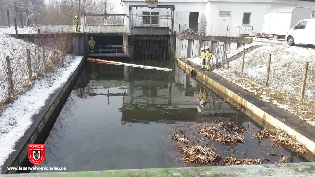 Da sich Öl auf dem Mühlbach befand, wurden zwei Ölsperren aufgebaut. Der Verursacher konnte nicht ermittelt werden. © Bild & Text: Feuerwehr Michelau