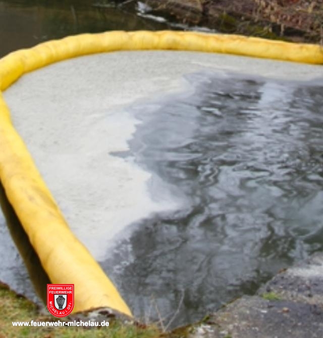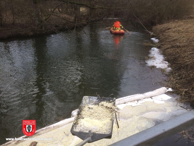Das gesättigte Ölbindemittel vom Vormittag wurde aufgenommen und gegen neues Bindemittel ausgetauscht. Desweiteren wurden mit dem Gerätesatz Boot noch letzte Ölreste im Dickicht vom Bach abgebunden und aufgenommen. © Bild & Text: Feuerwehr Michelau